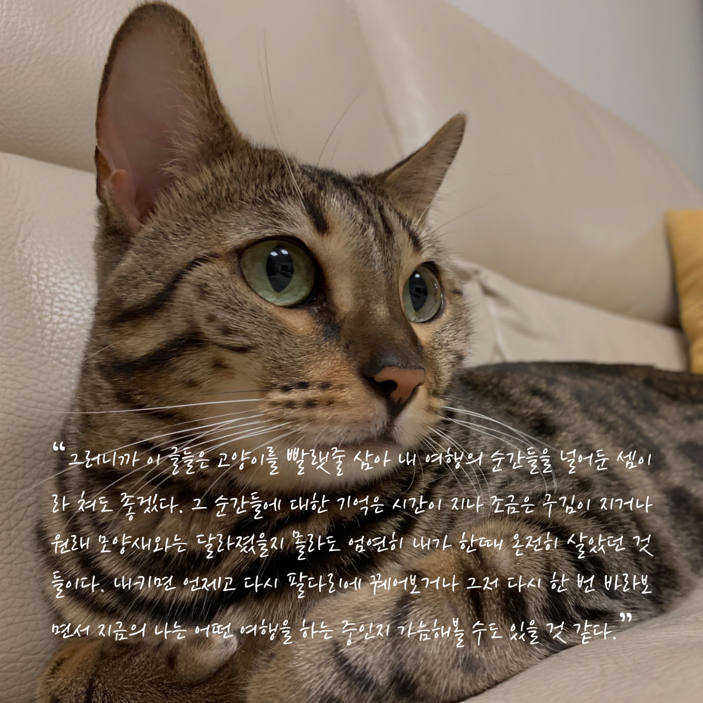 되살아나곤 하는 것이다. 그러니까 이 글들은 고양이를 빨랫줄 삼아 여행의 순간들을